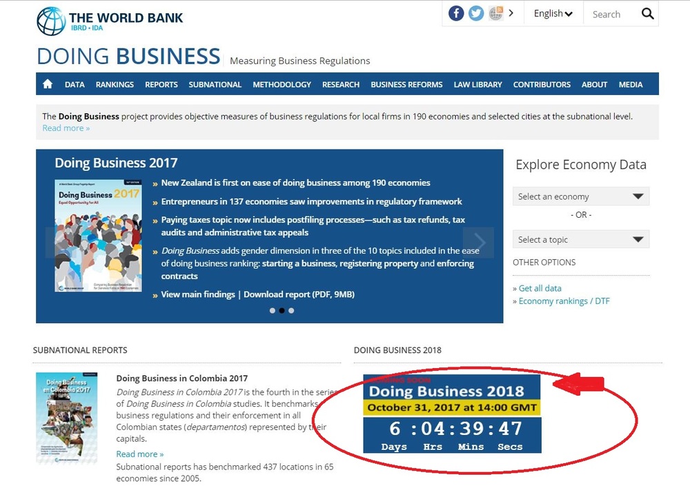 На сайте Всемирного банка раздела Doing Business отмечается, что рейтинг Doing Business-2018 будет обнародован 31 октября 2017 года в 14:00 (GMT). До обнародования рейтинга на страничке ВБ даже работает таймер.