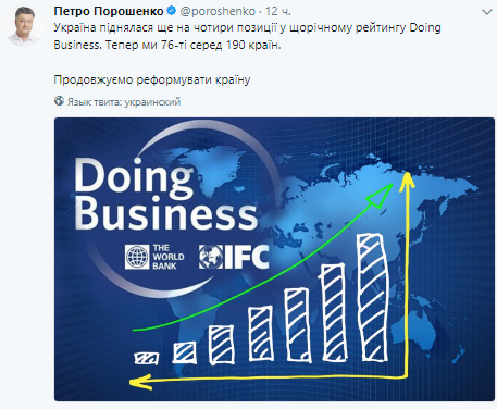 Вчера президент сделал пост о росте позиции Украины в рейтинге Doing Business, который ежегодно составляет Всемирный банк. "Украина поднялась еще на четыре позиции в ежегодном рейтинге Doing Business. Теперь мы 76-е среди 190 стран", – написал президент.