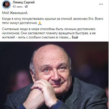 "Умер Михаил Жванецкий — безусловный гений нашей современности. Острый, меткий, колкий, бьющий наотмашь и наверняка, но никогда не делающий ударом больно, а почти всегда — смешно, но по-грустному, по-умному, по-житейскому. Огромная потеря для Одессы и всей Украины. Таких больше нет. Да и вообще великих у нас почти не осталось. Сейчас в цене хуторянство и примитивность. Но это не удивительно. И об этом ещё скажу отдельно.