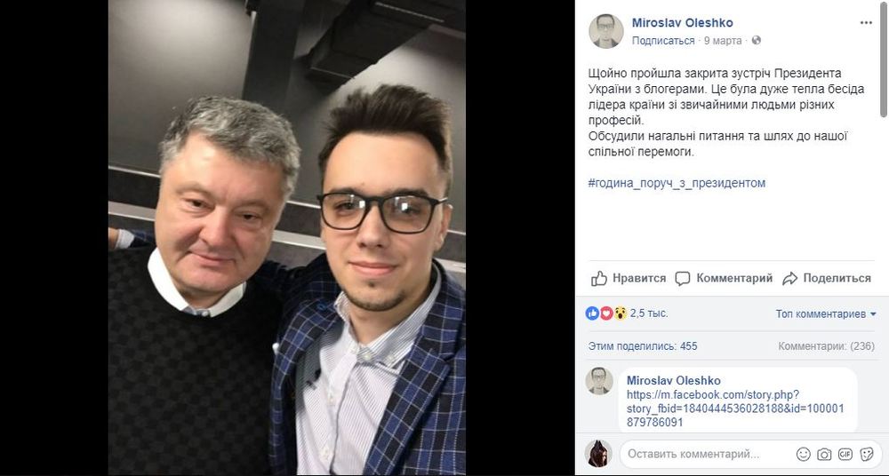 Об этом стало известно из поста одного из самых ярых поклонников президента – Мирослава Олешко. Он выложил совместное селфи с Петром Алексеевичем. Позже факт встречи подтвердили и остальные ее участники. Блогеры наполнили социальные сети потоками восхвалений и водопадами лести.