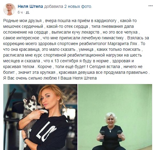 "Родные мои друзья, вчера пошла на прием в кардиологу, какой-то мешочек сердечный, какой-то отек сердца, типа пневмания дала осложнение на сердце, выписали кучу лекарств, но это все чепуха, самое интересное, что мне приписали лечебную гимнастику. Взялась за коррекцию моего здоровья спортсмен-реабилитолог Маргарита Лях", - написала Штепа на своей странице в Facebook.