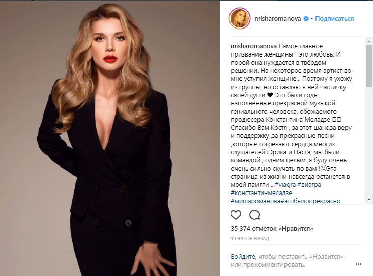 На днях певица Миша Романова написала в своем фотоблоге Instagram, что главное призвание женщины - это любовь и сообщила, что она покидает коллектив, в котором проработала 5 лет.