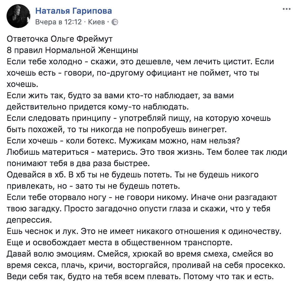 "Ответочка Ольге Фреймут. 8 правил Нормальной Женщины. Если тебе холодно – скажи, это дешевле, чем лечить цистит. Если хочешь есть – говори, по-другому официант не поймет, что ты хочешь. Если жить так, будто за вами кто-то наблюдает, за вами действительно придется кому-то наблюдать. Если следовать принципу – употребляй пищу, на которую хочешь быть похожей, то ты никогда не попробуешь винегрет. Если хочешь – коли ботокс. Мужикам можно, нам нельзя? Любишь материться – матерись. Это твоя жизнь. Тем более так люди понимают тебя в два раза быстрее. Одевайся в хб. В хб ты не будешь потеть. Ты не будешь никого привлекать, но – зато ты не будешь потеть. Если тебе оторвало ногу – не говори никому. Иначе они разгадают твою загадку. Просто загадочно опусти глаза и скажи, что у тебя депрессия. Ешь чеснок и лук. Это не имеет никакого отношения к одиночеству. Еще и освобождает места в общественном транспорте. Давай волю эмоциям. Смейся, хрюкай во время смеха, смейся во время секса, плачь, кричи, восторгайся, проливай на себя просекко. Веди себя так, будто на тебя всем плевать. Потому что так и есть", – написала Наталья.