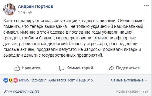 "Вышиванка – не только украинский национальный символ. Именно в этой одежде в последние годы грабили бюджет, мародерствовали, отмывали офшорные деньги, развивали кондитерский бизнес у агрессора, распределяли газовые активы, продавали депутатские запросы, добывали янтарь и выводили деньги с государственных предприятий", – написал известный юрист Андрей Портнов у себя на странице в социальной сети Facebook.