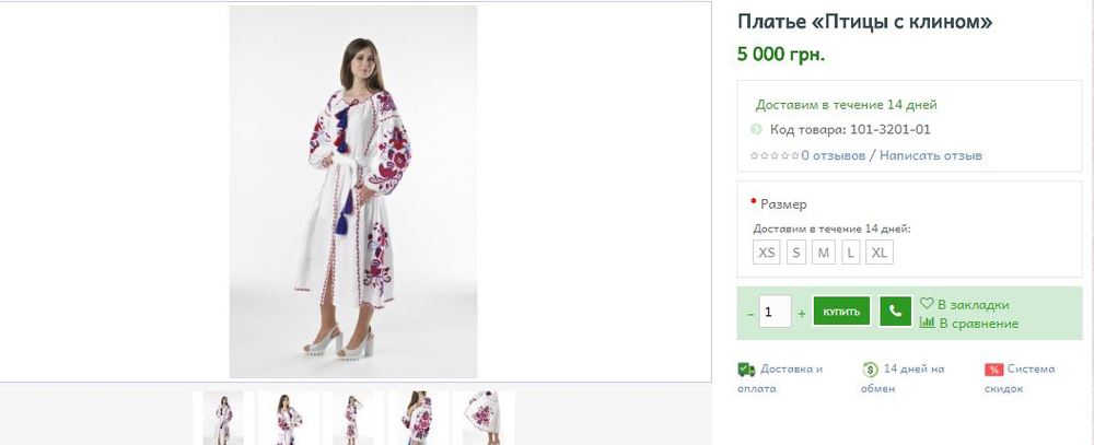 Как указано на сайте, платье – праздничная модель длины миди, выполненная из белоснежного льна и украшенная красно-синей вышивкой гладью. Изготовлено на украинском производстве.