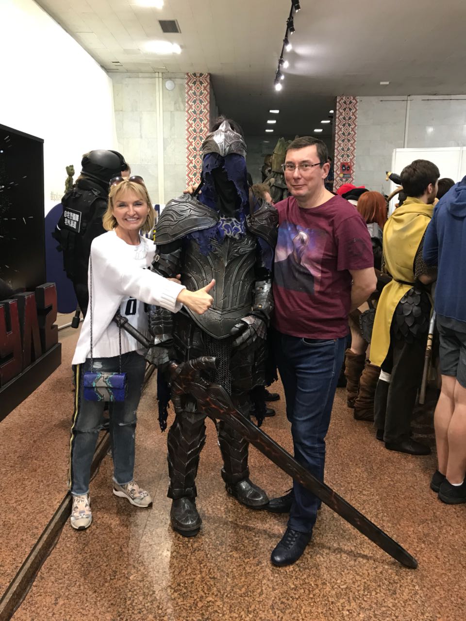 Генеральный прокурор Юрий Луценко и его жена народный депутат Ирина Луценко (БПП) засветились на необычном, как для таких важных людей, мероприятии. Пара пришла поддержать своего младшего сына Виталия на фестиваль Kyiv Comic Con. Здесь, 19-летний Виталий Луценко демонстрировал рыцарские латы, а точнее был в образе персонажа компьютерной игры Dark Souls.