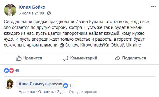 Сплела венок из цветов в Иванов день и Юлия Бойко, девушка главы Специализированной антикоррупционной прокуратуры. В выходные дни Юлия посетила Кировоградщину, откуда родом