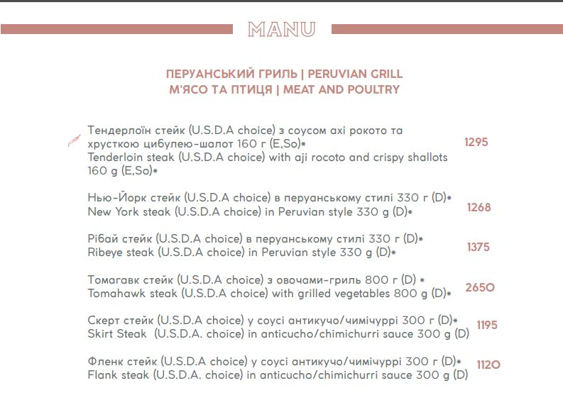 Съесть стейк тут можно в среднем за 1500 гривен. А некоторые жаренные куски мяса доходят до 2650 гривен.