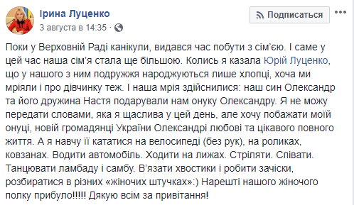 "Я не могу передать словами, как я счастлива в этот день, но хочу пожелать моей внучке, новой гражданке Украины Александре любви и интересной, полной жизни. А я научу ее кататься на велосипеде (без рук), на роликах, коньках. Водить автомобиль. Ходить на лыжах. Стрелять. Петь. Танцевать ламбаду и самбу. Вязать хвостики и делать прически, разбираться в различных "женских штучках". Наконец нашего женского полку прибыло". Спасибо всем за поздравления!", - написала Ирина Луценко.