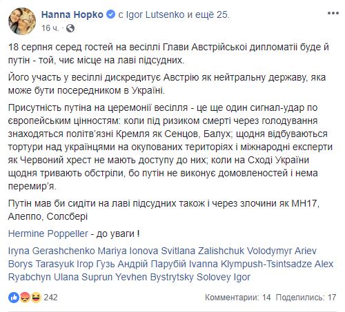 Народный депутат Анна Гопко (раньше "Самопомощь", сейчас беспартийная) уже отреагировала у себя на странице в социальной сети Facebook на обещание Путина посетить свадьбу главы МИД Австрии.
