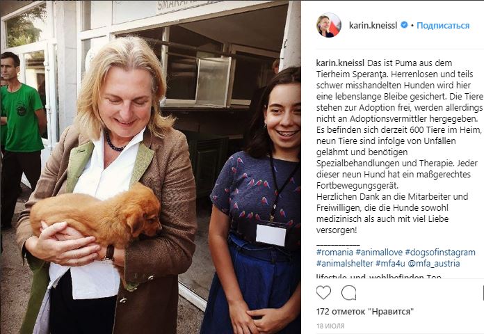 Карин Кнайсль родилась в семье личного пилота короля Иордании Хусейна, изучала право и ближневосточные языки, является экспертом по проблемам Ближнего Востока. Официально беспартийная, в конце 2017-го года она стала министром иностранных дел Австрии по квоте от ультраправой Австрийской партии свободы. Как и глава российского государства, Карин Кнайсль любит собак и охотно публикует фотографии с ними и другими животными в своих официальных "Твиттере" и фотоблоге "Инстаграм".