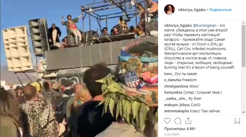 "Burning Man - это магия, убеждаюсь в этом уже второй раз! Чтобы пережить настоящий катарсис - приезжайте сюда! Самая крутая музыка - от Dixon и ZHU до SCRILL, Carl Cox, infected mushrooms. Фантастические арт-инсталляции. Искусство в чистом виде. И, главное, люди - открытые, любящие, свободные! Burning Man it's a lesson of being yourself!", - отметила жена Тигипко.