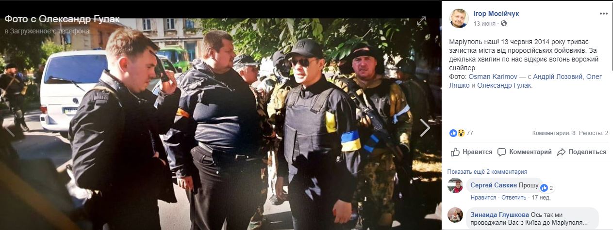 Вообще, вместе с радикалами Гулак уже давно. Вот фото Игоря Мосийчука в социальной странице Facebook, где отмечен Александр. Как гласит подпись под фото, это в Мариуполе во время "зачистки места от пророссийских боевиков".