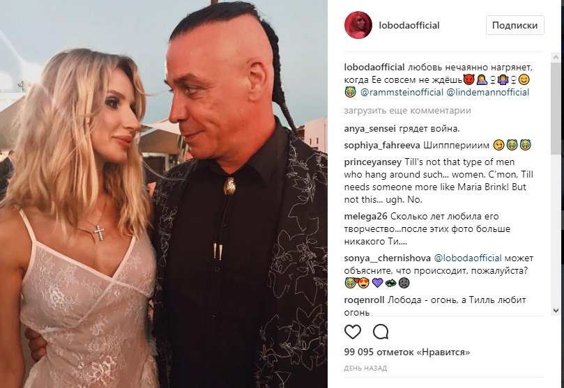 Впервые слухи о романе Лободы и Линдеманна появились после фестиваля "Жара" в Баку. Сеть облетели фото, на котором музыкант не сводит глаз со своей новой знакомой. Она обнародовала снимок в своем Instagram, сопроводив его подписью: "Любовь нечаянно нагрянет, когда ее совсем не ждешь". На афтепати в Баку пара сидела рядом и лидер немецкой группы обнимал певицу.