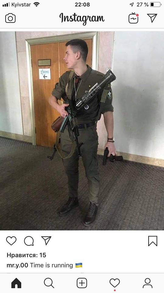 "Time is running" (время бежит - англ.) - написал сын мэра и добавил смайлик в виде уркаинского флага. На сыне Кличко висит гранатомет и два автомата "Калашникова".