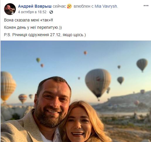 А спустя некоторое время Андрей Ваврыш, который консультирует команду Зе по развитию Киева, выложил у себя на странице в социальной сети Facebook фотографию со своей женой Татьяной и написал "Она сказала мне "да!".