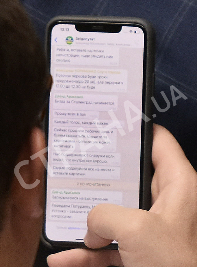 Тем временем, 39-летний депутат Павел Павлиш (СН) засветил переписку в рабочем чате фракции под названием "Зе!Депутат". Ведут свои письменные диалоги народные депутаты в мессенджере WhatsApp. Там, глава фракции 40-летний Давид Арахамия разослал инструкции, как себя сегодня вести и что делать.