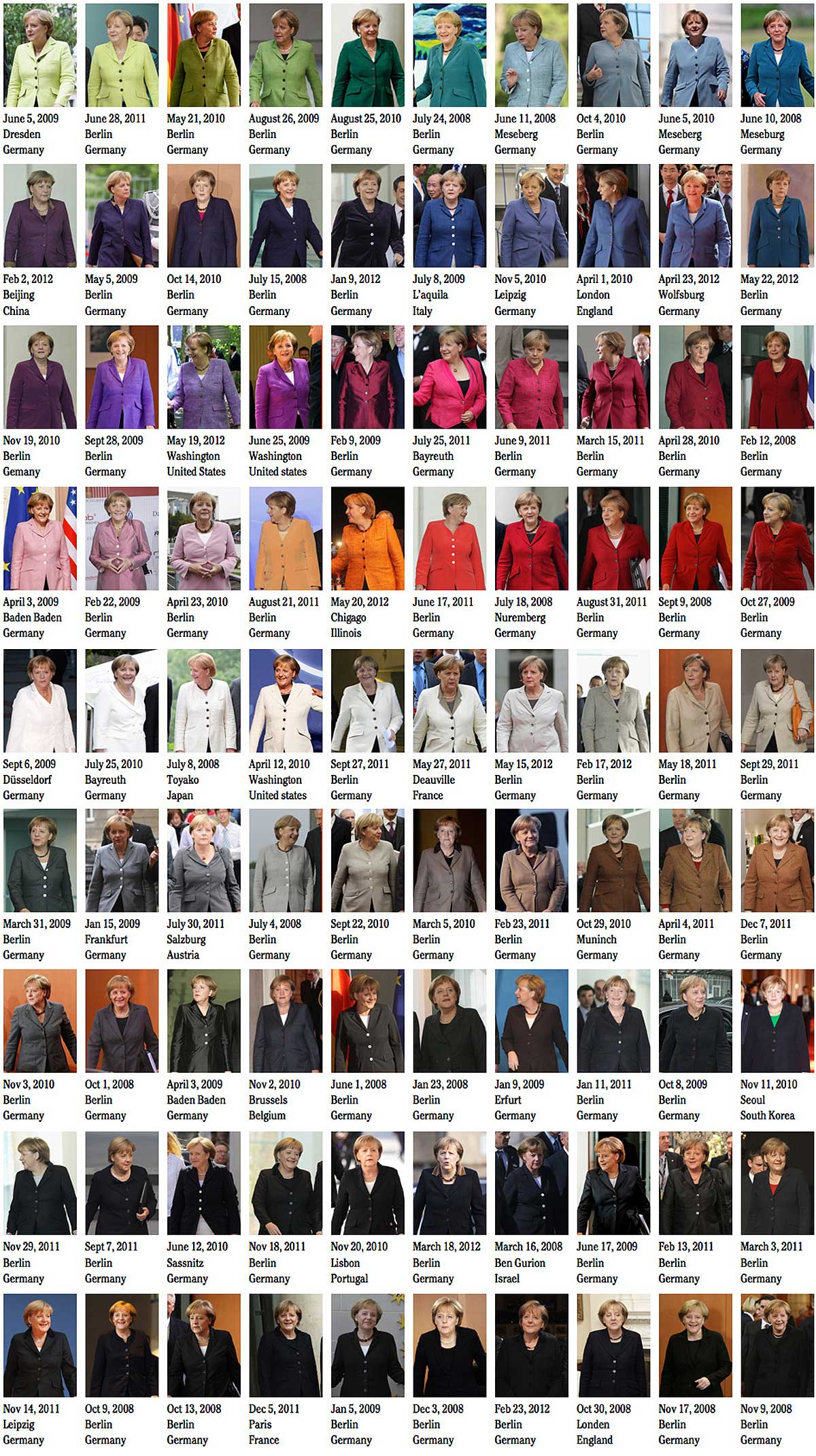 Голландский дизайнер Норте ван Экель по фотографиям Меркель с публичных мероприятий составил фотоколлаж, разложив ее пиджаки по цветовой гамме. Их оказалось более 90 и все они разных оттенков.