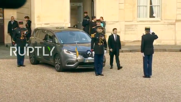 Президент Зеленский прибыл в Елисейский дворец на минивэне Renault Espace, его высадили далековато от ступенек, где его ждал Макрон.