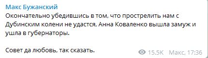 "Окончательно убедившись в том, что прострелить нам с Дубинским колени не удастся, Анна Коваленко вышла замуж и ушла в губернаторы. Совет да любовь, так сказать", - отметил он.