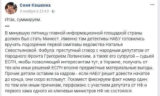 Кроме того, супругой народного депутата от "Народного фронта" Логвинского является судья ЕСПЧ Анна Юдковская. По сведениям журналистки Сони Кошкиной, детективы НАБУ в начале ноября готовились вручать подозрение первой замглавы Минюста Наталье Севостьяновой. "Фабула: преступный сговор с народным депутатом от Народного Фронта Григорием Логвинским, а также его супругой – судьей ЕСПЧ, якобы позволяющий интересантам тут, в Украине, получать от тех или иных решений ЕСПЧ вполне предметные материальные выгоды":