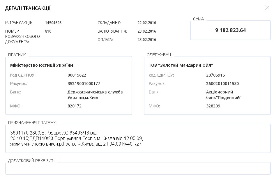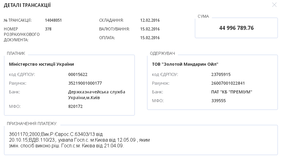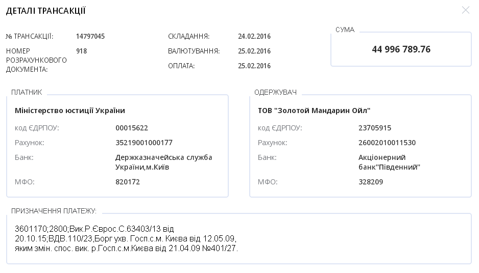 В реестре платежей казначейства "Є-дата" мы нашли три платежных поручения, указанные в определении суда. Как оказалось, Минюст заплатил "Золотому мандарину ойл" не 54, а почти 100 миллионов гривен тремя платежами – два раза почти по 45 миллионов, и один раз больше 9 миллионов: