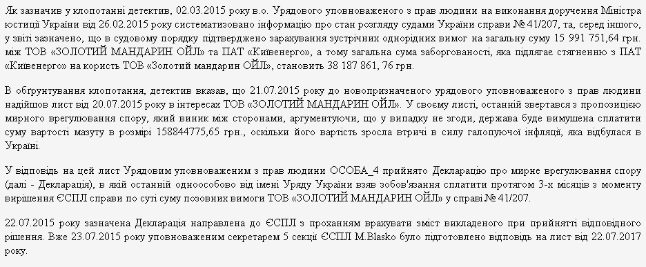 В случае с долгом "Киевэнерго", "Золотой мандарин ойл" правительственный уполномоченный по правам человека в июле 2015 года подписал документ, который назывался "Декларация о мирном урегулировании спора". В нем единолично от имени Кабмина принял обязательства оплатить долг фирме из госбюджета. Декларация была направлена в ЕСПЧ, и на следующий день европейский суд снял иск фирмы с рассмотрения "в связи с мирным урегулированием спора". Затем, в феврале 2016 года, Минюст тремя платежами выплатил "Золотому мандарину ойл" 54 миллиона гривен.