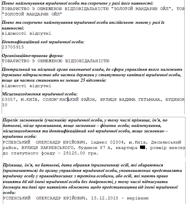 Еще одна странность – как раз перед получением денег, в декабре 2015 года, в "Золотом мандарине ойл" сменился учредитель и директор. Им стал киевлянин Александр Успенский Об этом говорится в выписке из реестра юридических лиц, который получила "Страна":