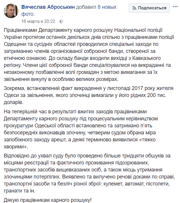 Первый заместитель главы Национальной полиции Украины Вячеслав Аброськин 16 марта рассказал на своей странице в Фейсбуке о задержании в Одессе банды, которая занималась похищением людей.