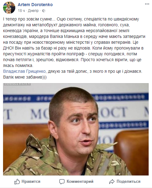 Ветераны опять полны возмущения. Вот, к примеру, один из негодующих постов на тему – бойца АТО Артема Доротенко.