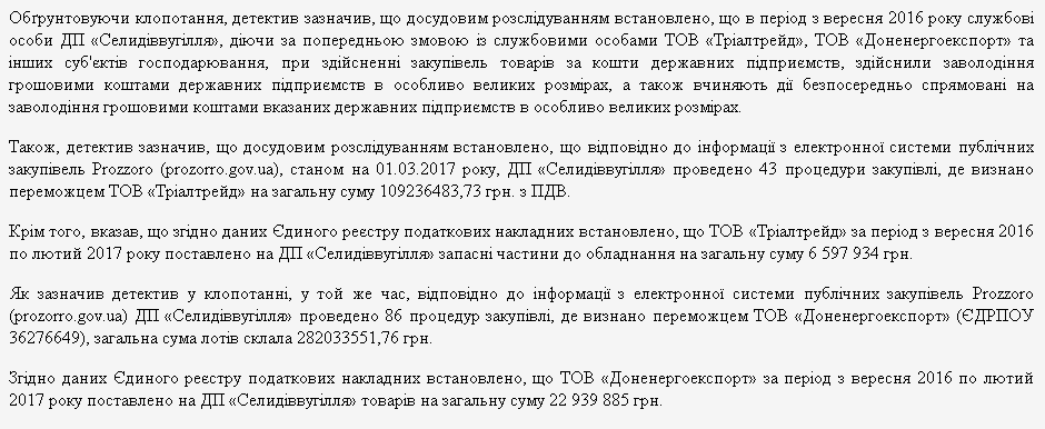 Далее в определении суда говорится, что обе компании конкурировали на тендерах "Селидовоугля". Однако обе компании использовали один и тот же IP-адрес для регистрации налоговых накладных. Кроме того, в штате "Донэнергоэкспорта" числились только три человека, а в штате "Триалтрейда" - только один. Это дало НАБУ основания считать, что фирмы связаны друг с другом, и между ними и должностными лицами ГП "Селидовуголь" имел место предварительный сговор на совершение преступлений.