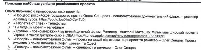 Интересно, что руководитель данного проекта Ольга Журженко также участвовала в ряде проектов, посвященных теме Сенцова. Об этом говорится в проектной заявке, которая является приложением к опубликованному договору: