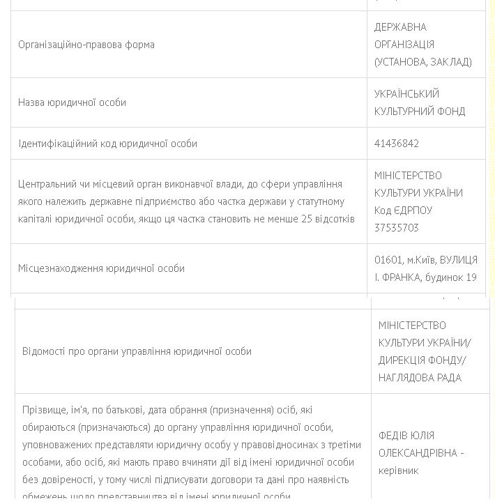 Юлия Федив указана руководителем фонда в едином реестре юридических лиц: