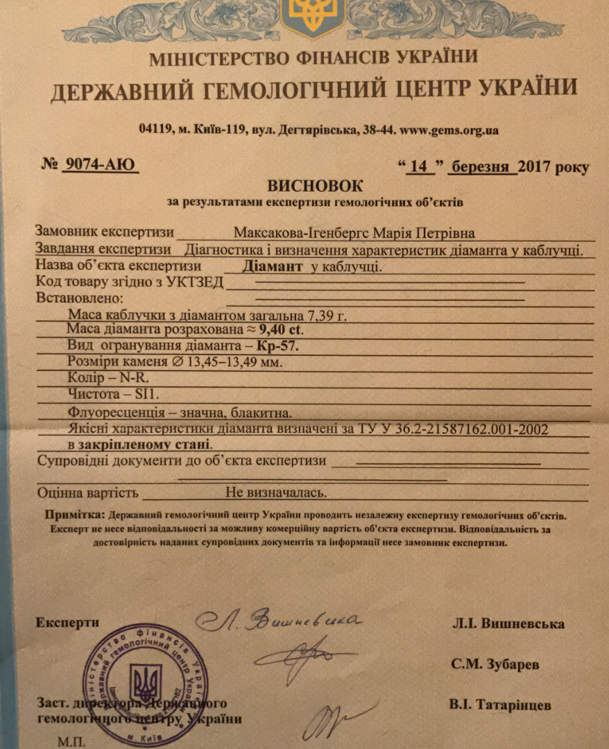 Выводы Государственного геммологического центра Украины о бриллианте Вороненкова, источник фото: "Страна"