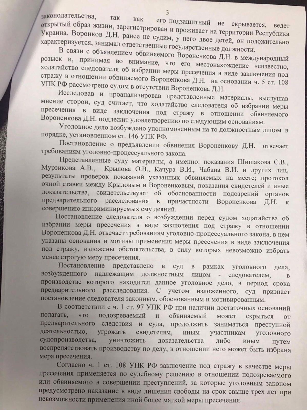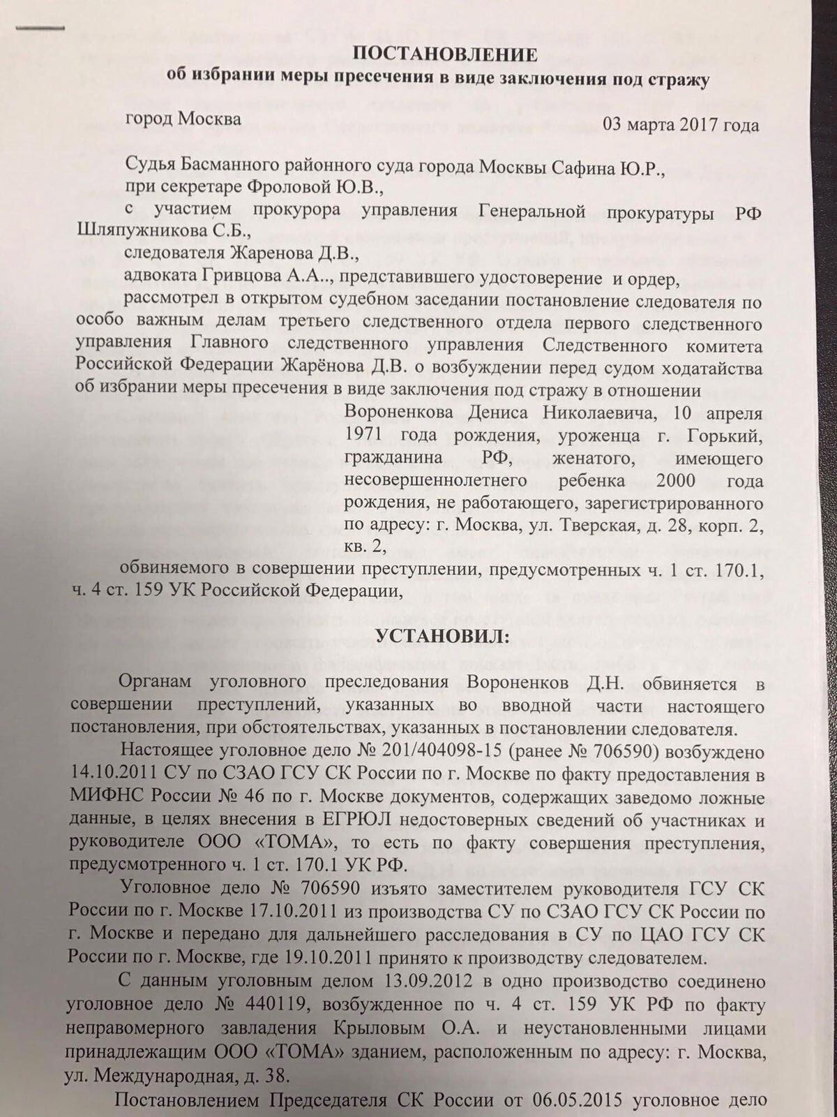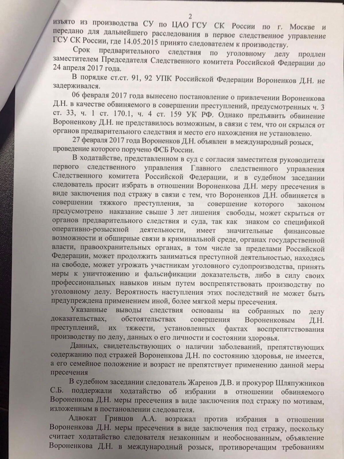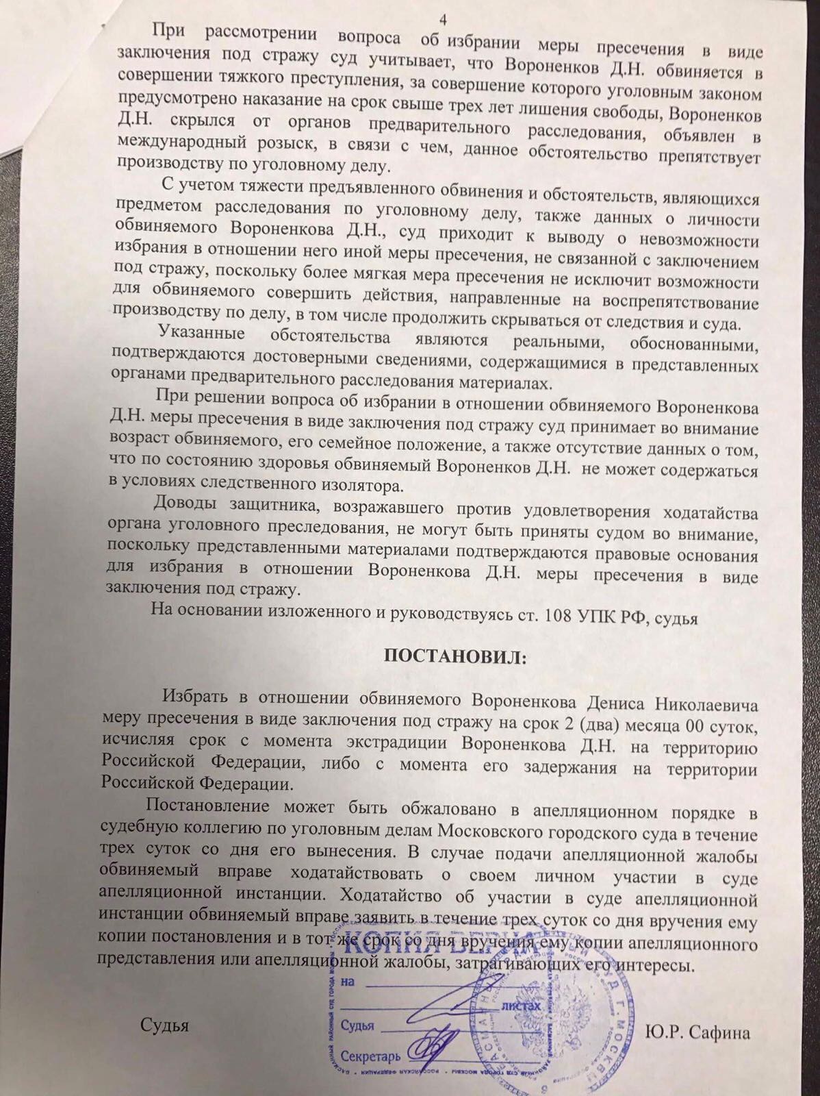 Ответ на этот вопрос дает постановление Басманного райсуда Москвы, датированное 3 марта. Судя по всему, копия этого судебного решения была переслана Вороненкову его адвокатом Андреем Гривцовым.