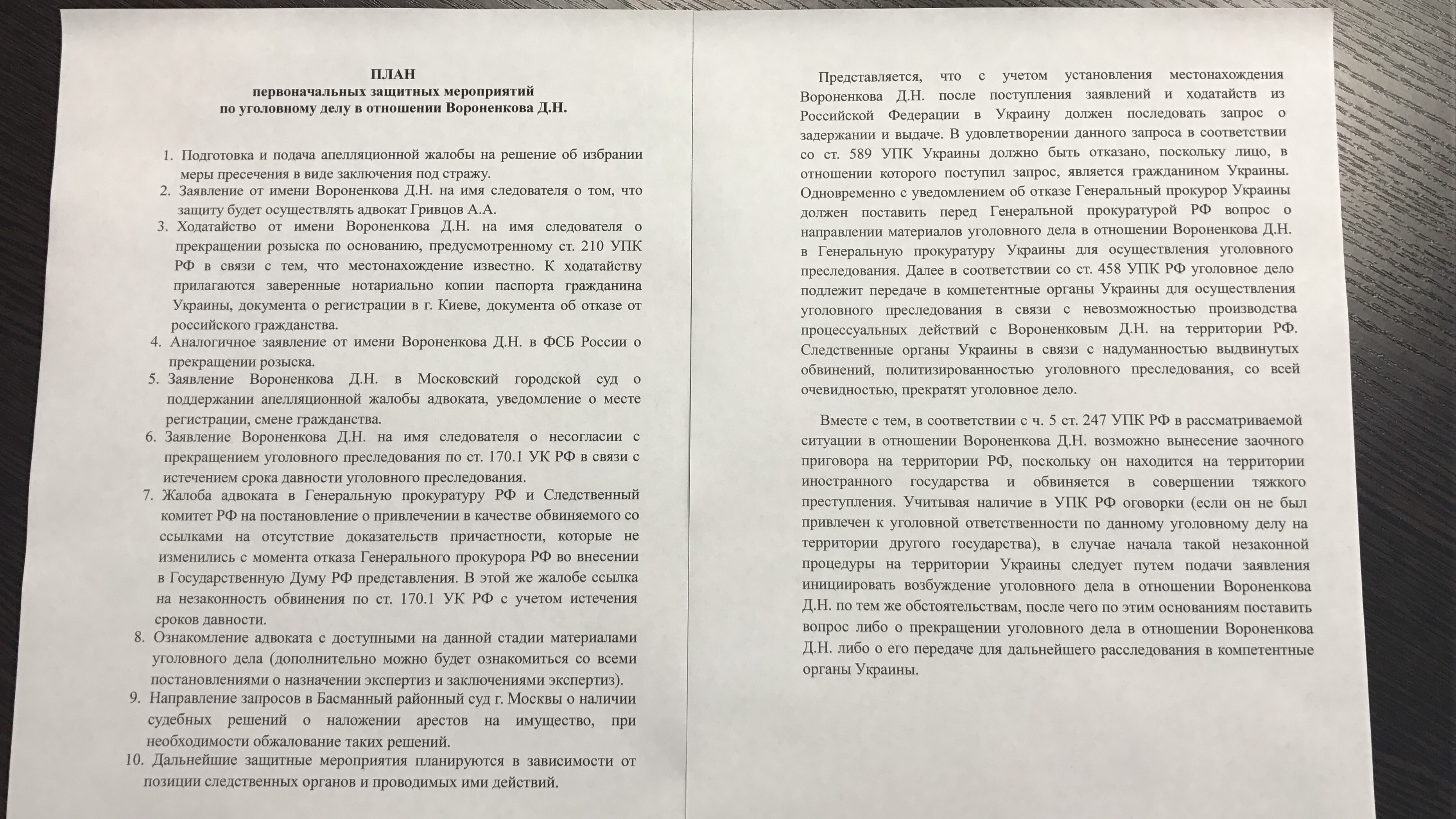 После чего адвокат направил Вороненкову не только копию судебного решения о его аресте, но и стратегию дальнейшей защиты с учетом случившегося в Басманном суде. План предусматривал десять пунктов, среди которых ходатайство о снятии его с розыска. Для этого и были нужны нотариально заверенные копии украинского паспорта и сведения о регистрации Вороненкова в общежитии в хрущевке на столичных Нивках, а также заявление об отказе от российского гражданства и вступлении в украинское.