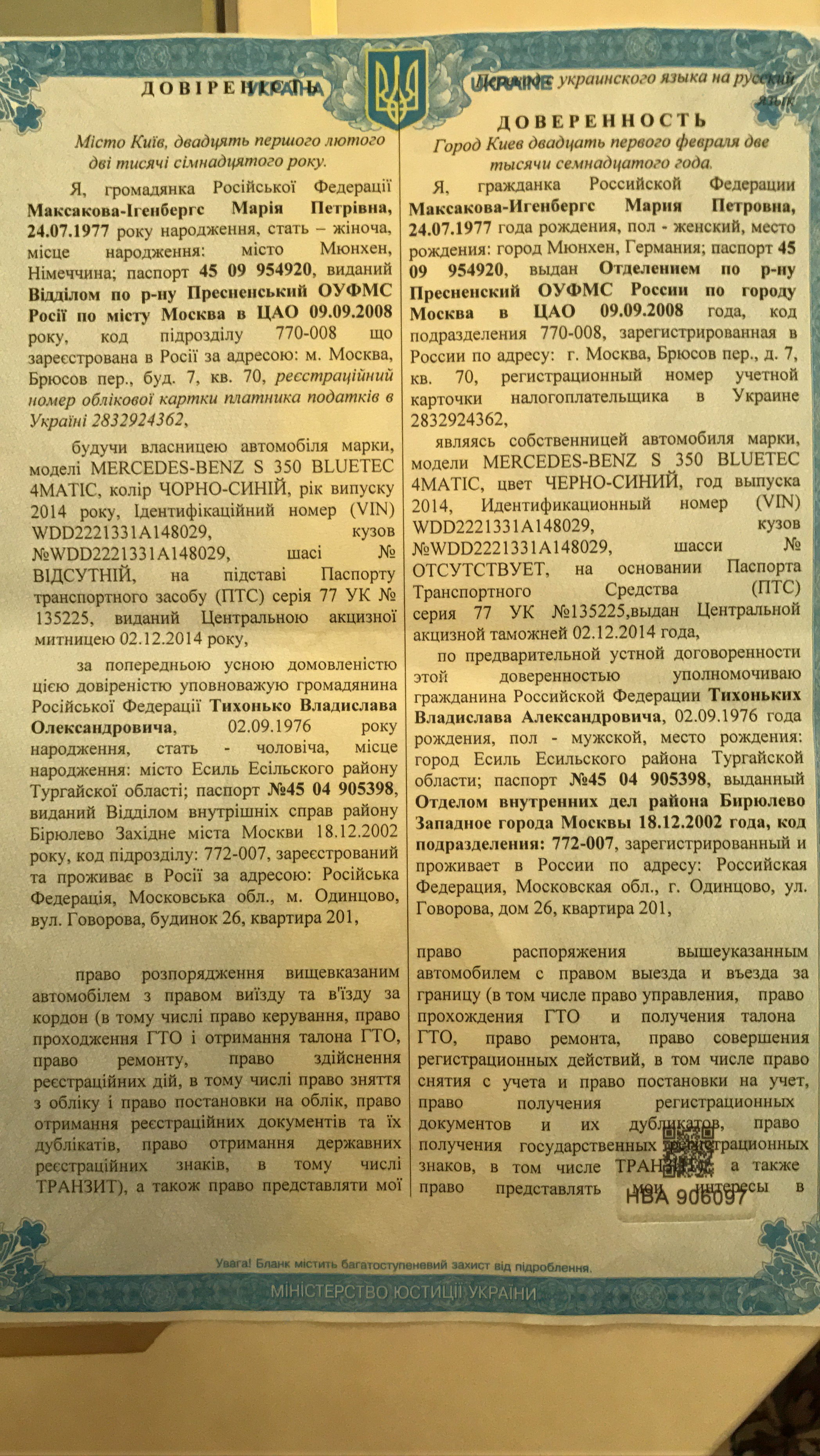 Чтобы доставить машину в Киев, супруги решили воспользоваться услугами водителя Владислава Тихоньких. На его имя Максакова еще 21 февраля в Киеве оформила доверенность, дающую право управления транспортным средством.