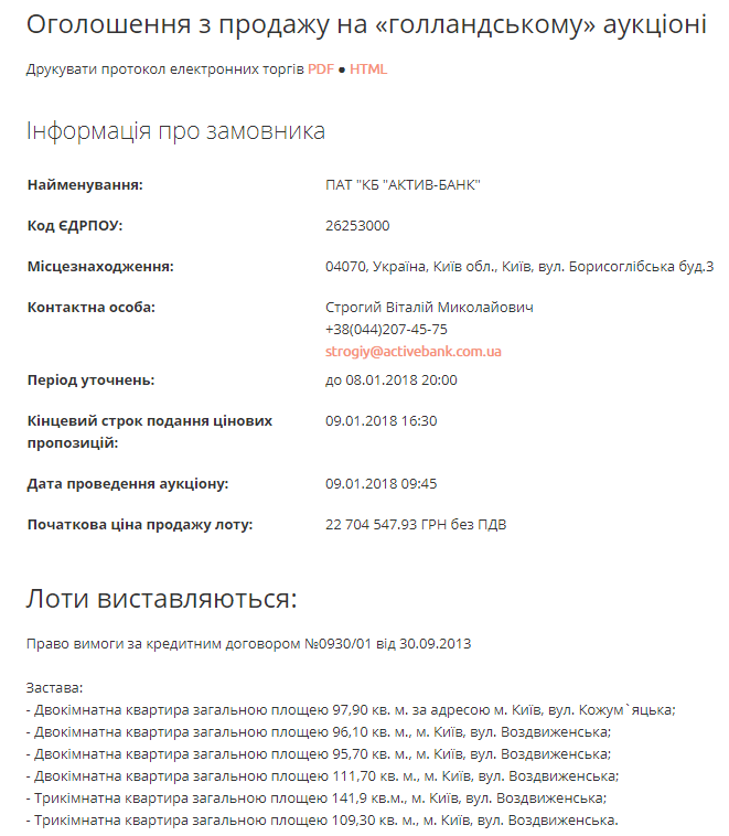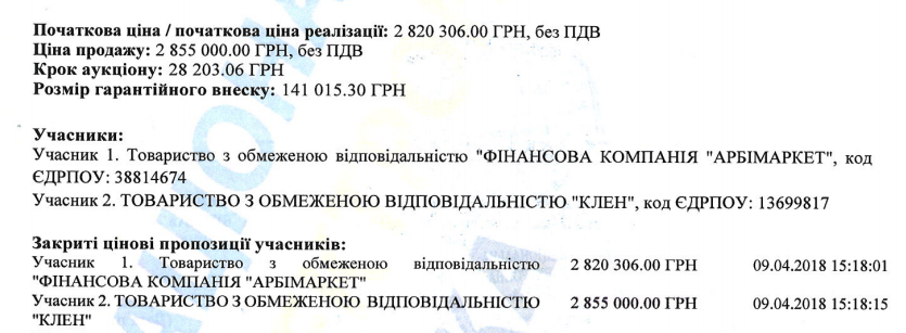 Кредит, обеспеченный квартирами, выкупило ООО "Клен" за 11,4 млн грн. При этом начальная цена была 22,7 миллионов. То есть, объекты были куплены за полцены. Договор был подписан 5 февраля.