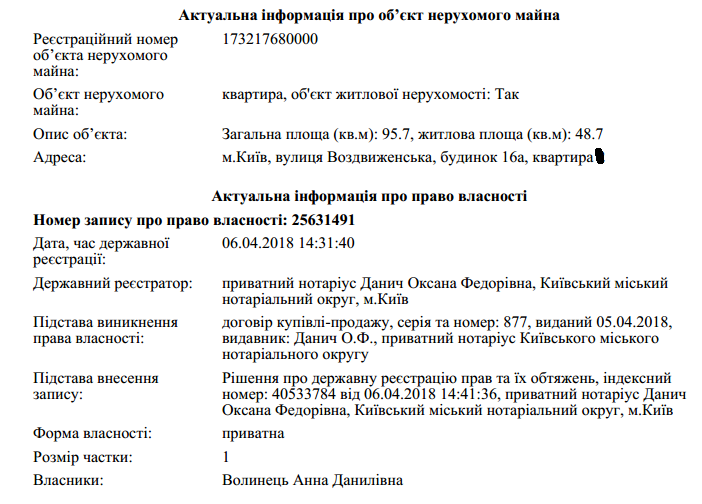 Раньше на дочек Волынца и Маркаровой Анну и Марию была также записана приобретенная в 2007 году 123-метровая квартира в Киеве. Ее Оксана Маркарова задекларировала в 2017 году: