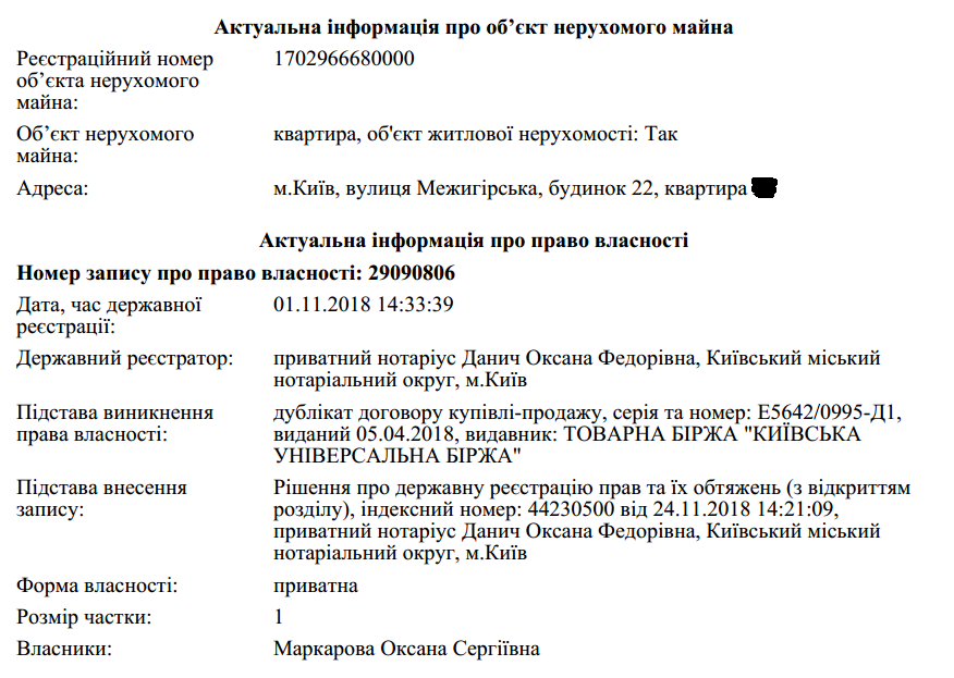 Сама Оксана Маркарова 1 ноября этого года оформила на себя "странную" квартиру. Странная она тем, что в реестре недвижимости не указана ее площадь. А оформление проводилось не по оригиналу, а по дубликату договора купли-продажи, заключенному еще в апреле этого года: