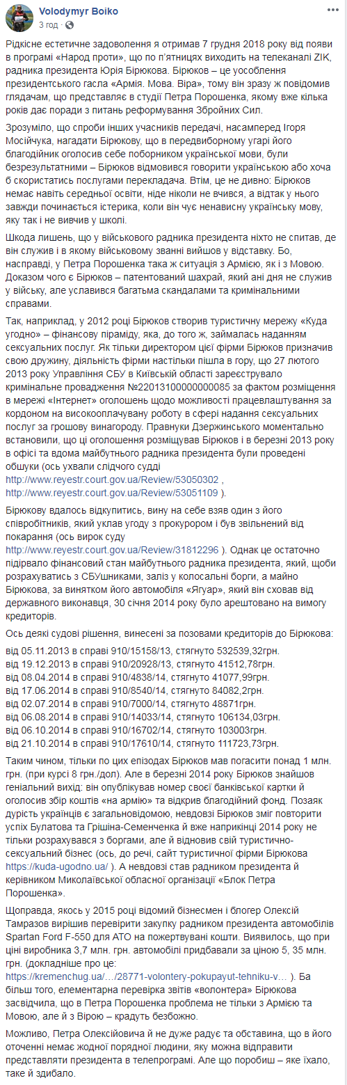 Известный журналист Владимир Бойко опубликовал в Facebook скандальный пост, в котором обвинил советника Порошенко по вопросам армии Юрия Бирюкова в создании финансовой пирамиды. Кроме того, по словам Бойко, фирма Бирюкова занималась предоставлением сексуальных услуг.