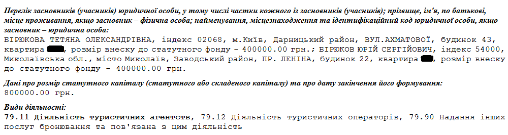 "Страна" получила сведения из реестра юридических лиц об учредителях "ОСВ Тревел" на начало 2013 года. Информация журналиста Владимира Бойко полностью подтвердились: учредителями данной фирмы в то время были Татьяна и Юрий Бирюковы: