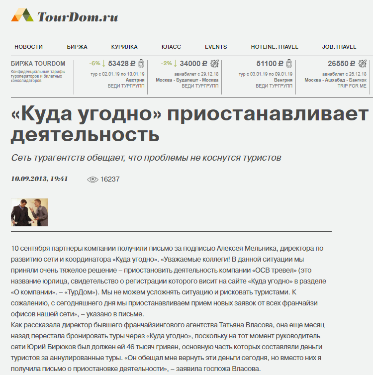 Уже 10 сентября 2013 года на отраслевом сайте "ТурДом" появилось сообщение о том, что сеть турагентств "Куда угодно" приостанавливает деятельность. А руководитель сети Юрий Бирюков остался должен контрагентам десятки тысяч гривен, основную часть которых составляли деньги туристов за аннулированные туры.