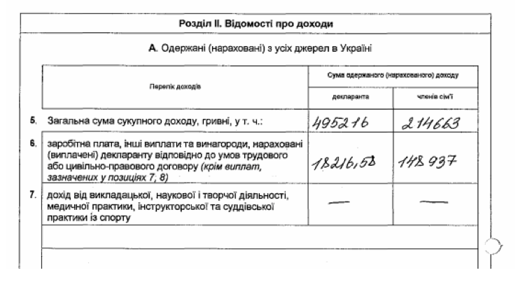 При поступлении на работу в ВСП в 2015 году Татьяна Малашенкова задекларировала за 2014 год заработок у себя 495 тысяч гривен и у мужа 214,6 тысяч гривен: