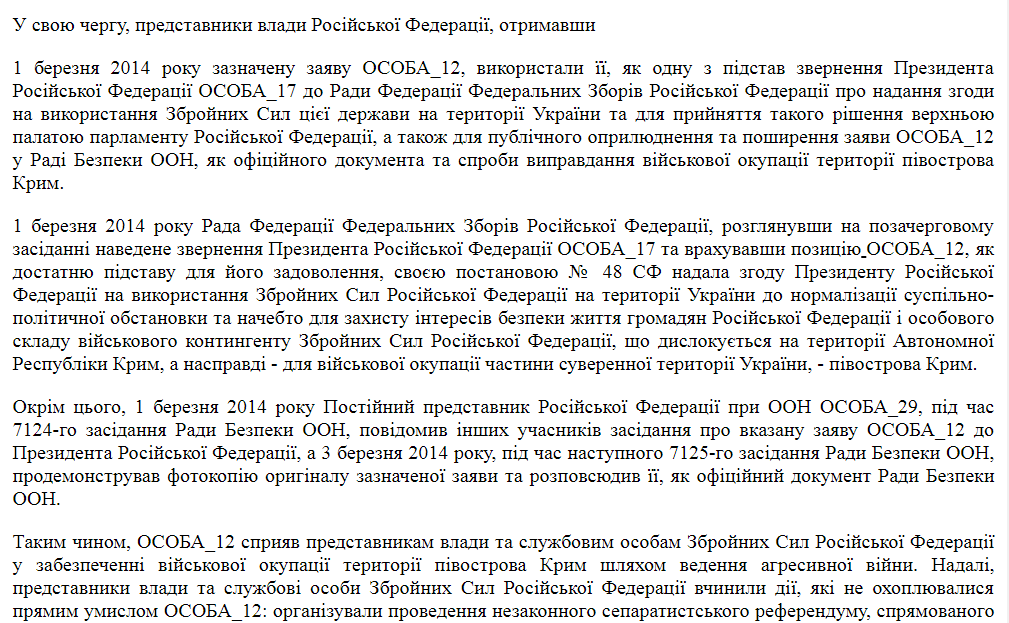 Дальше суд в приговоре утверждает, что заявление Януковича было использовано как одно из оснований обращения Президента РФ к Совету Федерации о предоставлении согласия на использование Вооруженных Сил РФ на территории Украины, и для принятия такого решения верхней палатой парламента РФ.