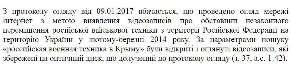 Еще один вид доказательств, которые использовались против Виктора Януковича – ролики из интернета. Суд сообщил в приговоре, что был проведен "осмотр сети интернет" с целью выявления видеозаписей по параметру поиска "российская военная техника в Крыму":