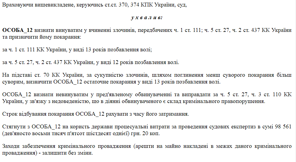 В итоге по приговору суда Януковичу за госизмену заочно дали 13 лет, за ведение агрессивных военных действий – 12 лет.