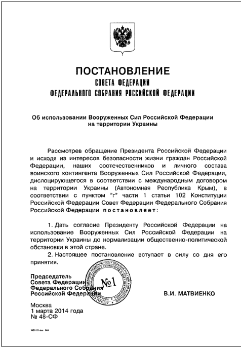 Речь идет о постановлении Совета Федерации № 48-СФ от 1 марта 2014 года, которым верхняя палата российского парламента дала согласие на использование Вооруженных Сил РФ на территории Украины "до нормализации общественно-политической обстановки" и "для защиты интересов безопасности жизни граждан РФ".