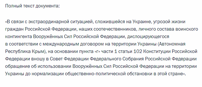 Данный документ был принят на основании обращения Владимира Путина к Совету Федерации. В тексте обращения Путина к СФ, опубликованном на сайте российского Президента, какие-либо упоминания о заявлении Виктора Януковича тоже отсутствуют: