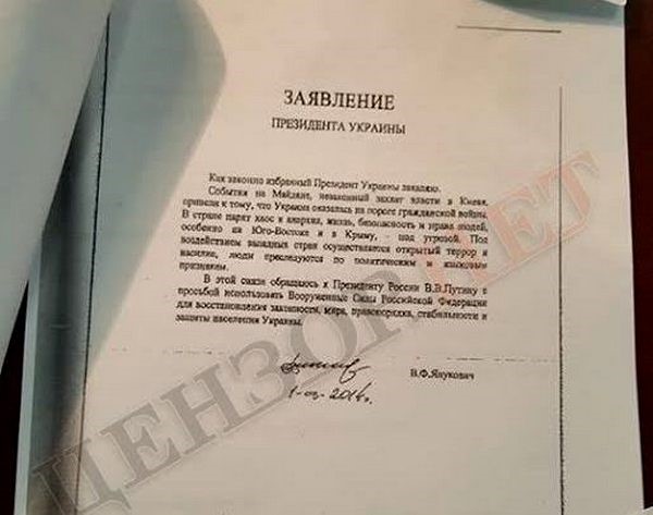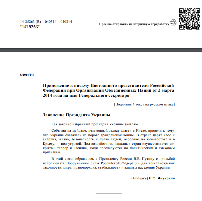 О том, что Янукович обратился с заявлением к российскому президенту, стало известно на заседании Совета безопасности ООН 3 марта 2014 года. Тогда постпред России Виталий Чуркин показал присутствующим и зачитал этот документ: